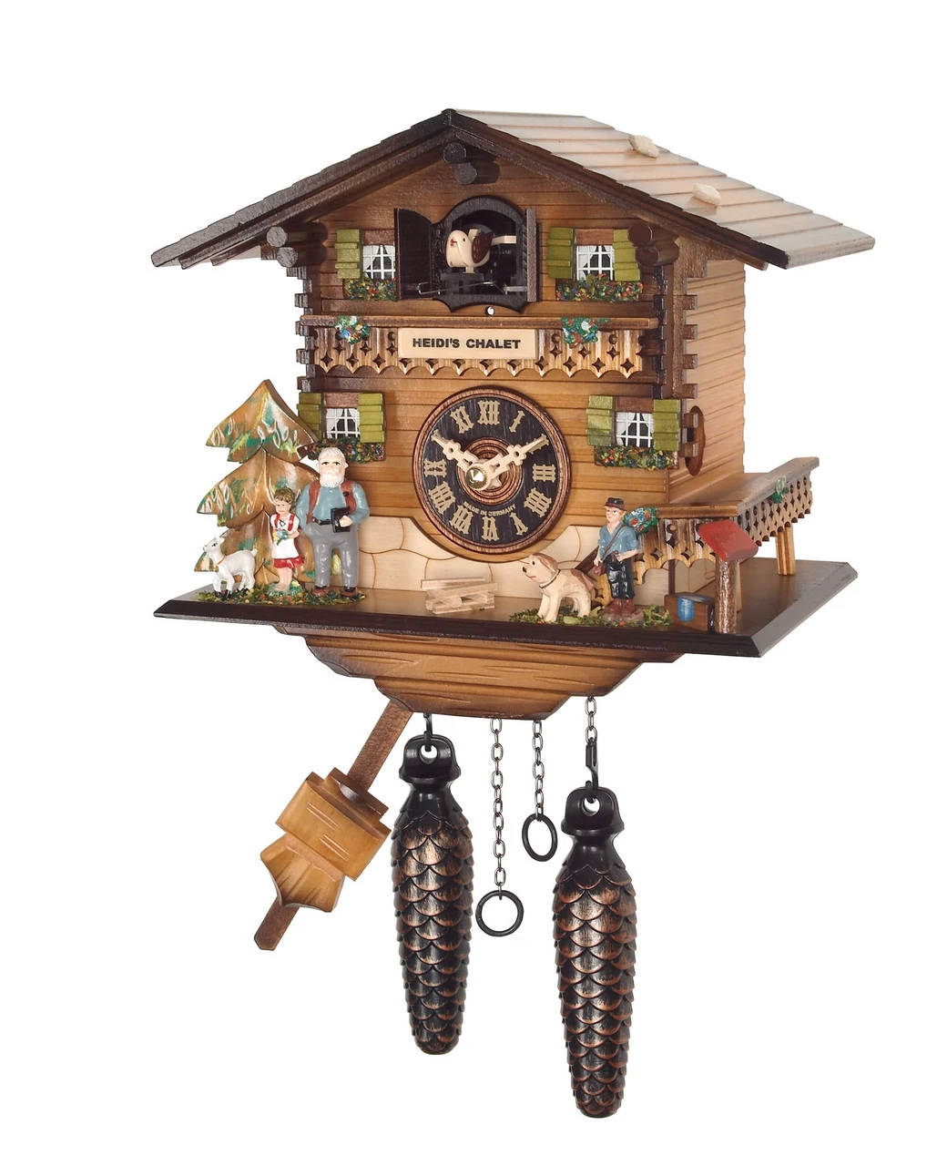 Ce modèle de coucou illustre une scène de la vie quotidienne d’Heidi, le fameux personnage de roman créé par l’écrivain suisse Johanna Spyri en 1880. C’est devenu un personnage mythique de la Suisse et fait partie des histoires les plus célèbres pour enfants.