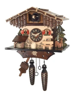 Quand le coucou chante (un coup Ă la demie et le nombre de coups Ă l’heure), la porte qui est au-dessus du cadran, s’ouvre.