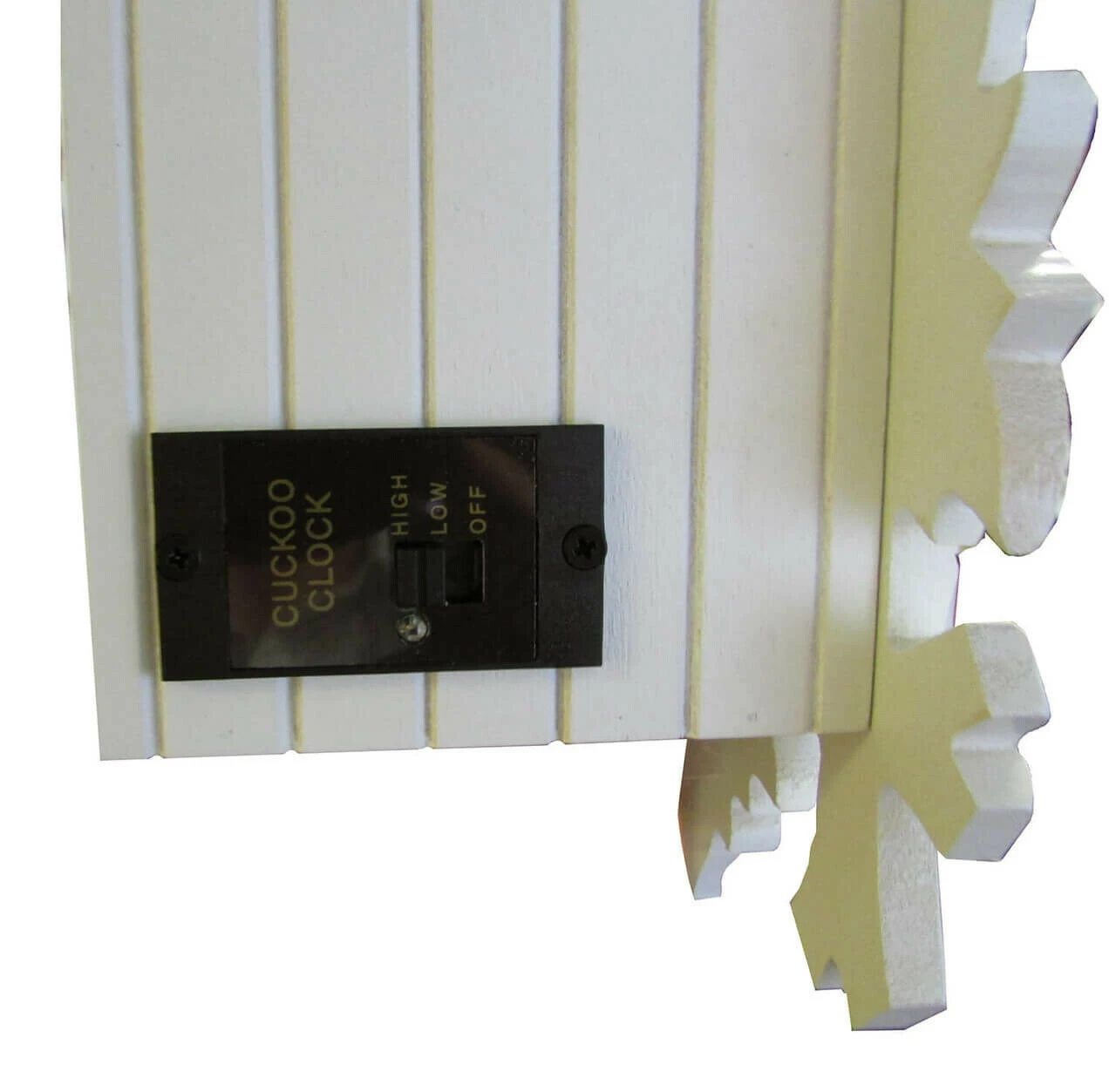 Sur le coté gauche (cf : photos) de tous les coucous à quartz se trouve un interrupteur pour le son : « Fort », « Faible », ou « Eteint ».