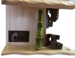 Coucou sans remontage, les poids de la pendule sont fictifs afin de respecter la tradition du coucou, s’en avoir les contraintes du remontage. Ce modĂšle est rĂ©alisĂ© en bois de tilleul. Les dĂ©cors et les sculptures inspirĂ©s des maisons de gare sont exĂ©cutĂ©s Ă la main. Vous serez subjuguĂ©s par le chant du coucou, l’Ă©cho de la forĂȘt et la mĂ©lodie qui se dĂ©clenchent au passage de l’heure.
