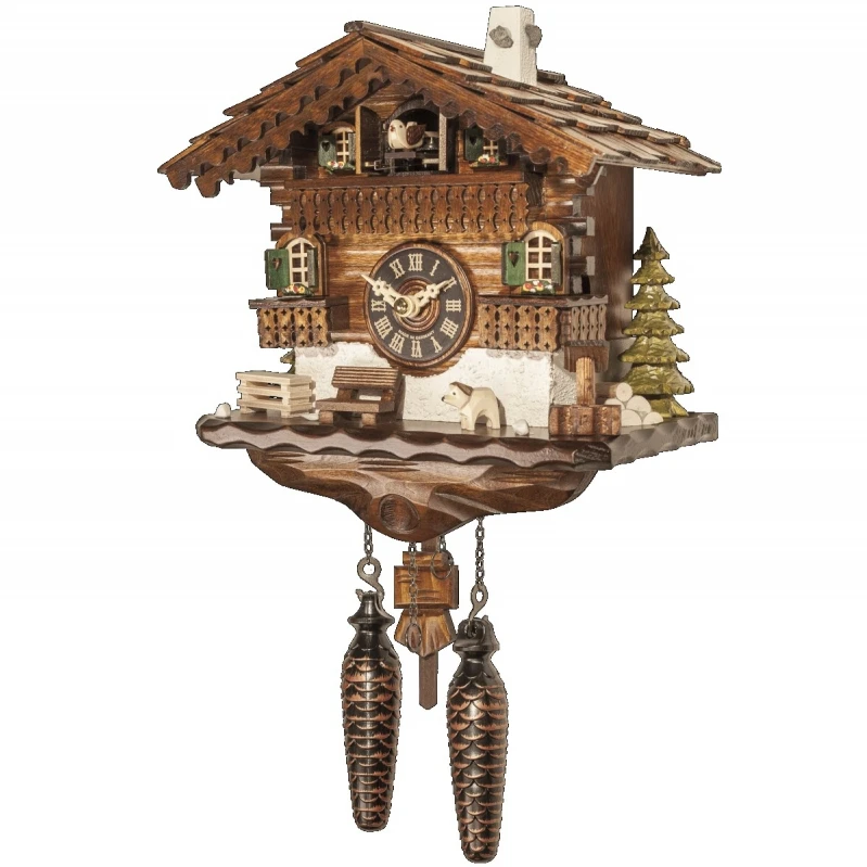 Ce modèle de coucou illustre une scène de la vie quotidienne en forêt, avec un chien qui garde le chalet en sécurité.