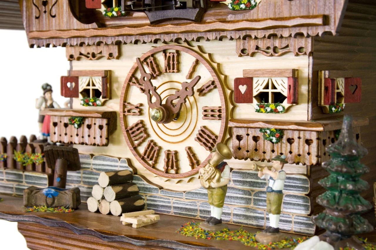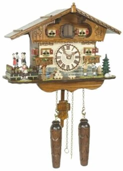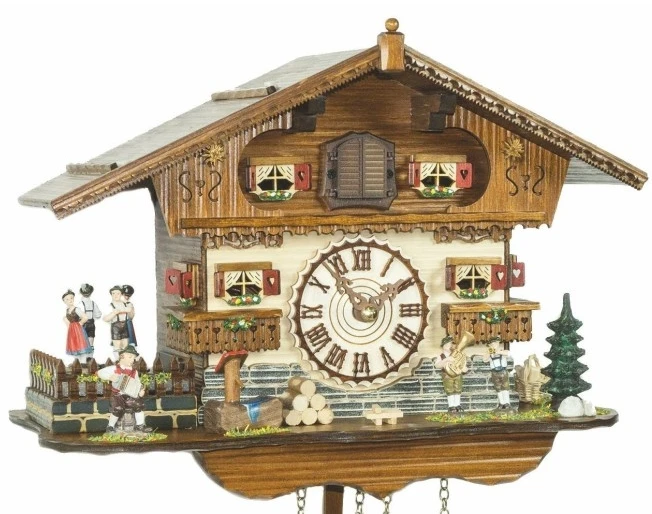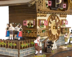 Ce coucou traditionnel en bois de la Forêt Noire vous propose un décor de scène dansante typique de Bavière.