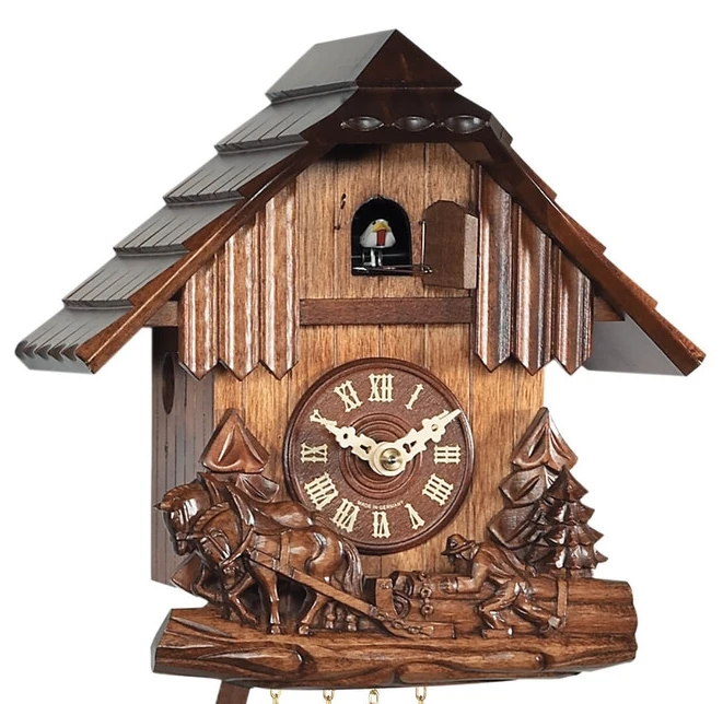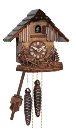 Ce coucou met en scène le dur labeur de la terre. On y voit des chevaux qui tirent du bois, accompagnés d’un laboureur. Ce modèle totalement réalisé un bois sculpté vous ravira par son authenticité et la chaleur qu’il apportera à votre intérieur.