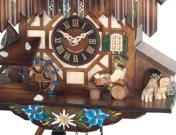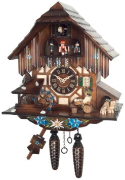 Quand le coucou chante, (un coup à la demie et le nombre de coups à l’heure) la porte qui est au- dessus du cadran s’ouvre. A l’heure une animation avec des danseurs se met en route et le buveur boit sa bière. Un remontage quotidien des trois poids par les deux chaînes sera nécessaire pour les remettre en haut quand ils sont descendus.