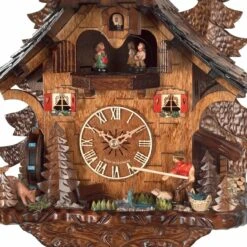 Quand le coucou chante, (un coup à la demie et le nombre de coups à l’heure) la porte qui est au- dessus du cadran s’ouvre. A l’heure une animation avec des danseurs se met en route et les enfants basculent sur leur jeu. Un remontage quotidien des trois poids par les deux chaînes sera nécessaire pour les remettre en haut quand ils sont descendus.