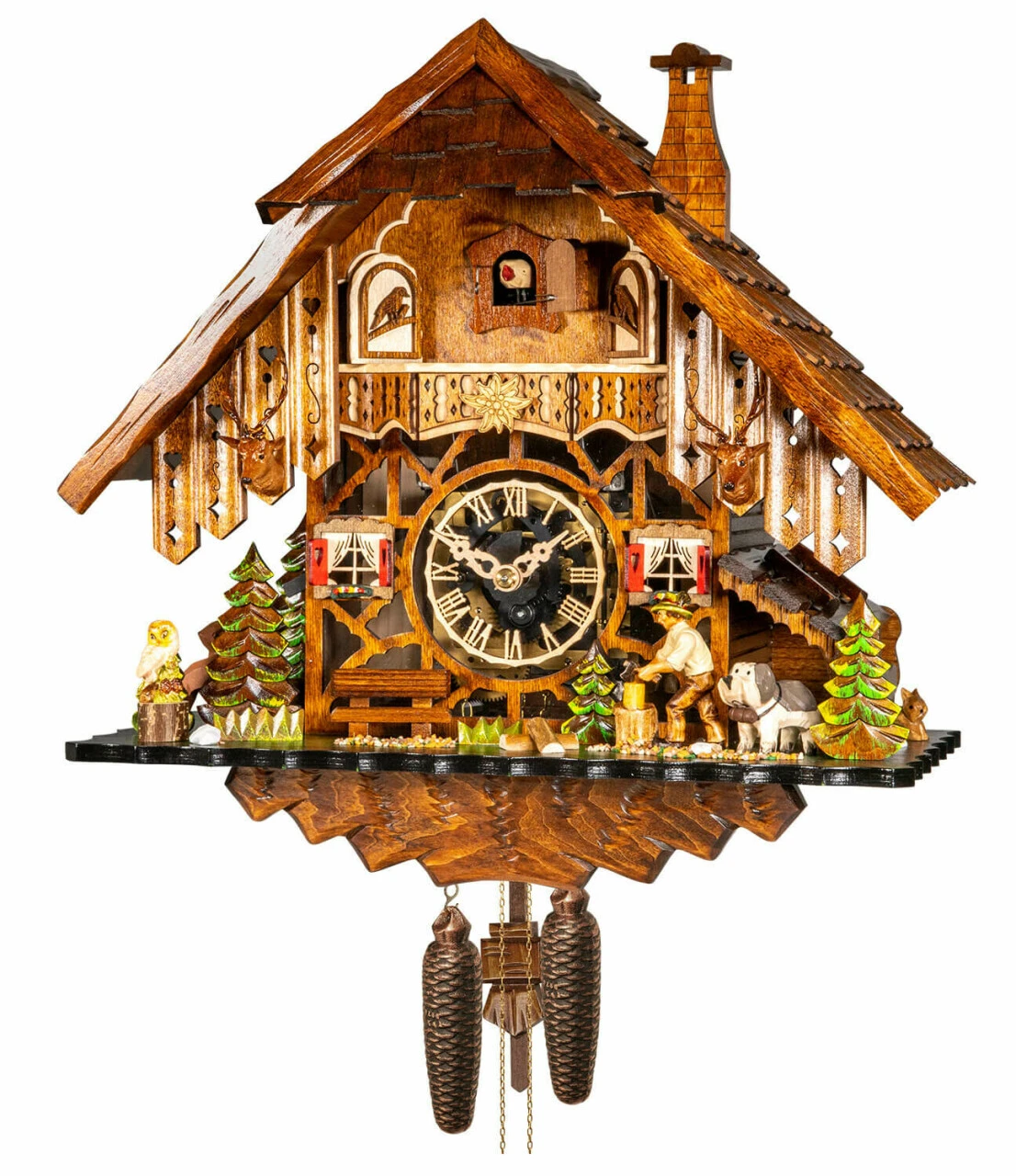 Vous serez charmés par son animation : quand le coucou sonne le nombre de coups à l’heure, la porte au-dessus du cadran s’ouvre et le bûcheron coupe du bois.