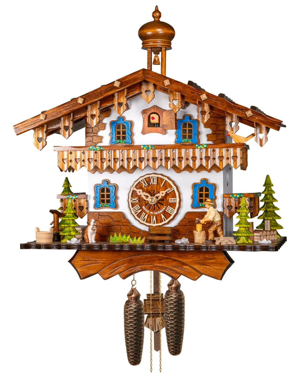 Avec sa façade blanche et ses volets bleus, ce coucou de forme chalet traditionnel égayera votre intérieur tout en l’animant. Au passage de l’heure, l’oiseau coucou sortira de son logement et chantera le nombre de coups. Puis, le bucheron se mettra à couper du bois.