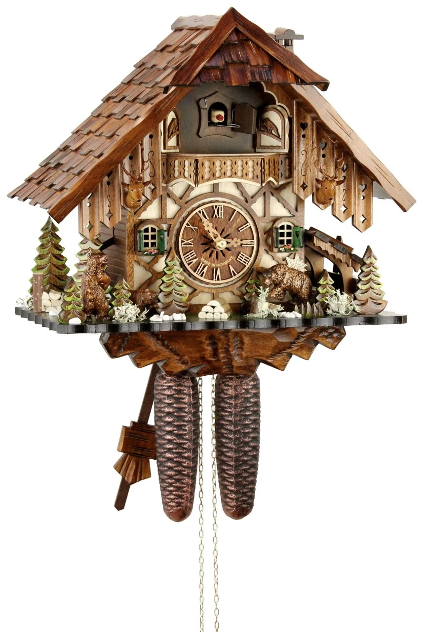 Fiez vous à la qualité de réalisation des coucous mécaniques fabriqués en Forêt Noire, entièrement réalisé à la main. Le contraste des couleurs rehaussera la décoration de votre intérieur et vous serez subjugués de voir l’animation des petits personnages au rythme du passage des heures de la journée.