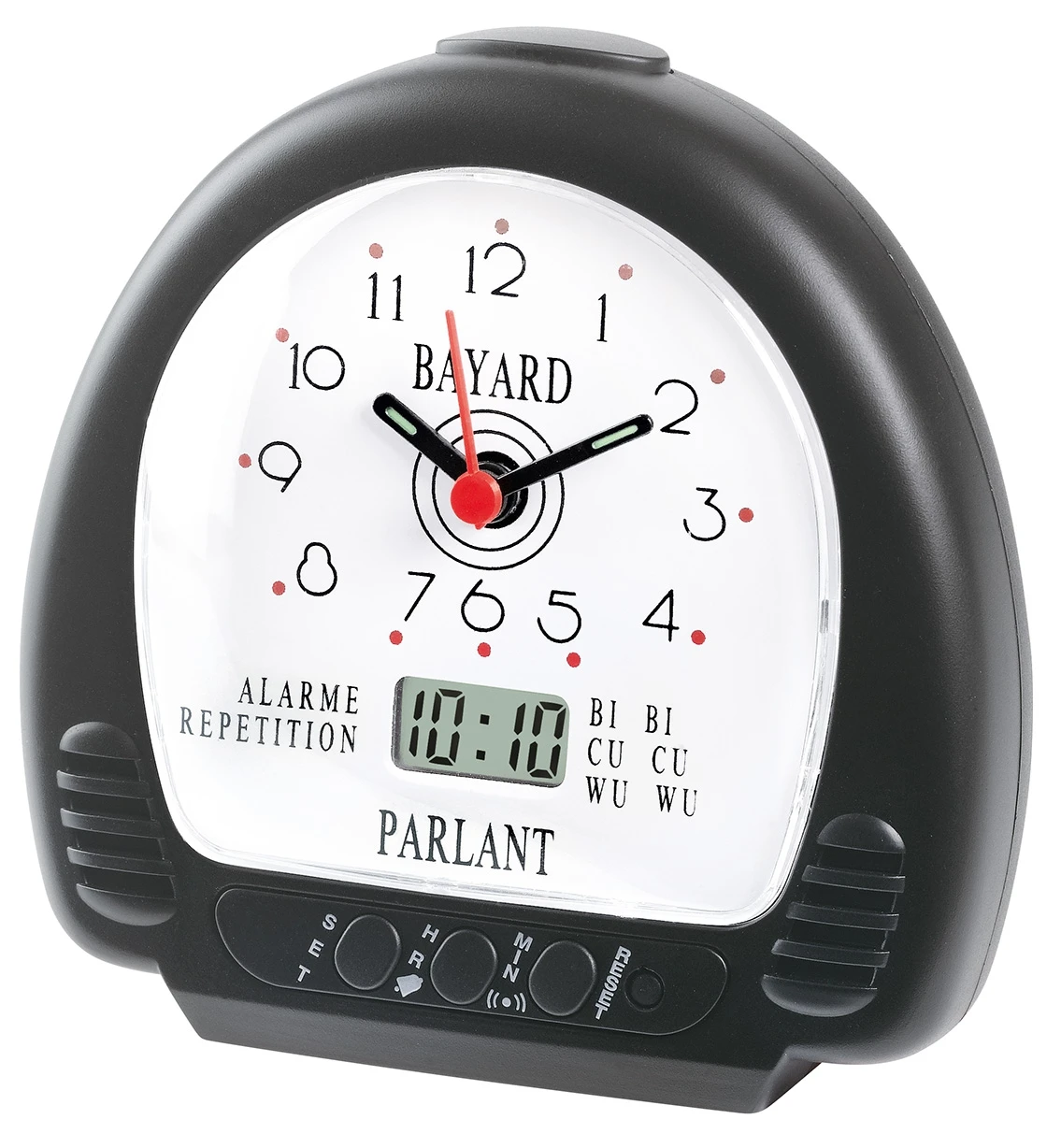 Le réglage de ce réveil Bayard se fera très simplement grâce à ses boutons de commande en façade. A chaque fois que vous appuyez sur le bouton, le réveil vous donne l’heure. Si vous souhaitez que le réveil vous donne l’heure automatiquement à chaque heure sans appuyer sur le bouton, c’est possible en activant la programmation.