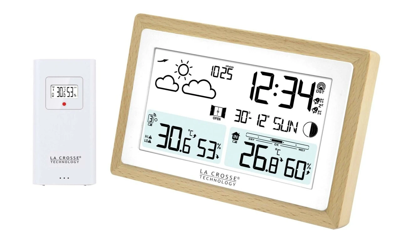Cette station météo vous sera très utile dans votre quotidien grâce à toutes ses fonctionnalités. L’originalité de ce modèle porte sur son entourage en bois ainsi que sur l’icône d’aération de pièce. En effet, par une fenêtre fermée ou ouverte, cet icône vous indiquera s’il faut aérer la pièce ou pas. Malin, non ?!